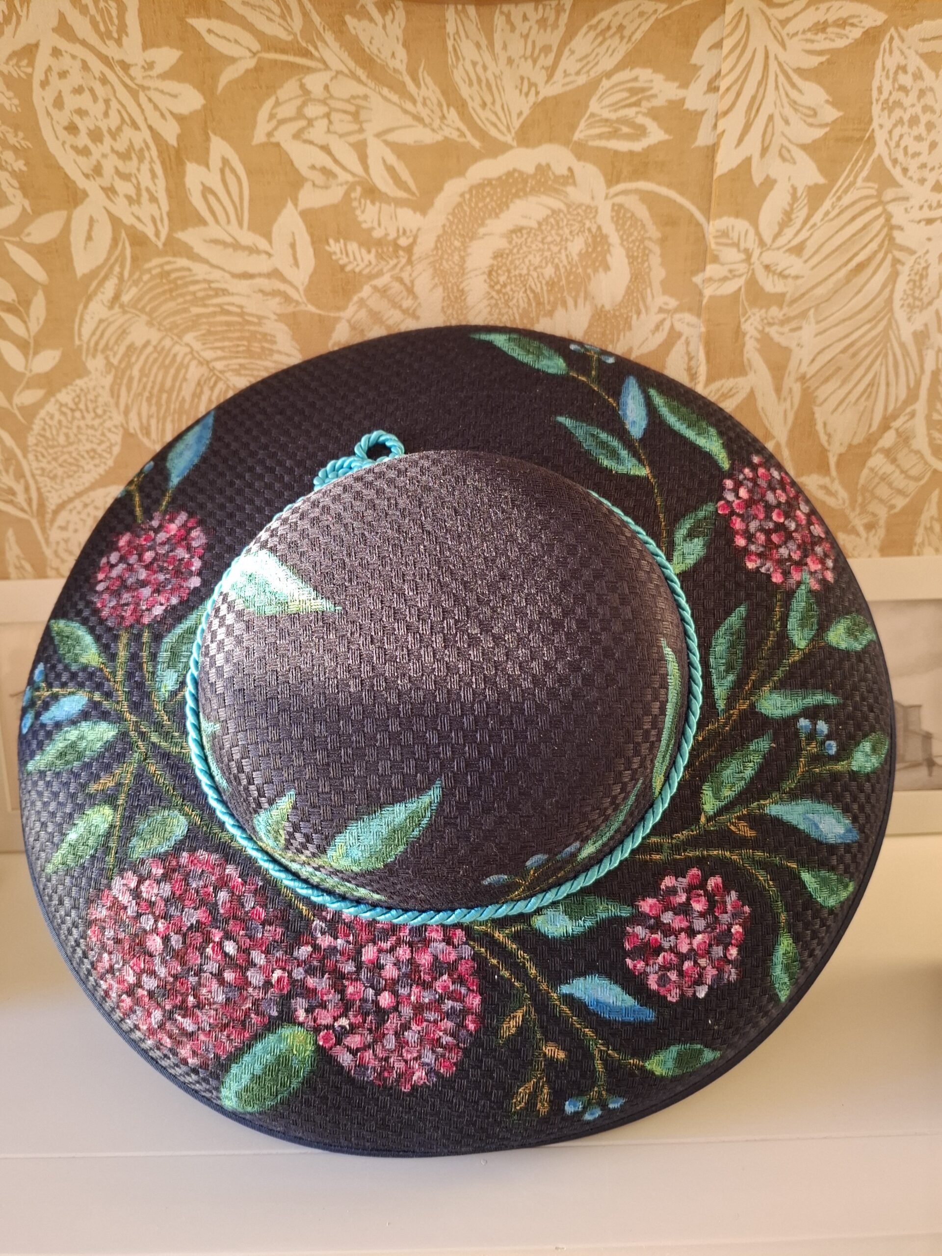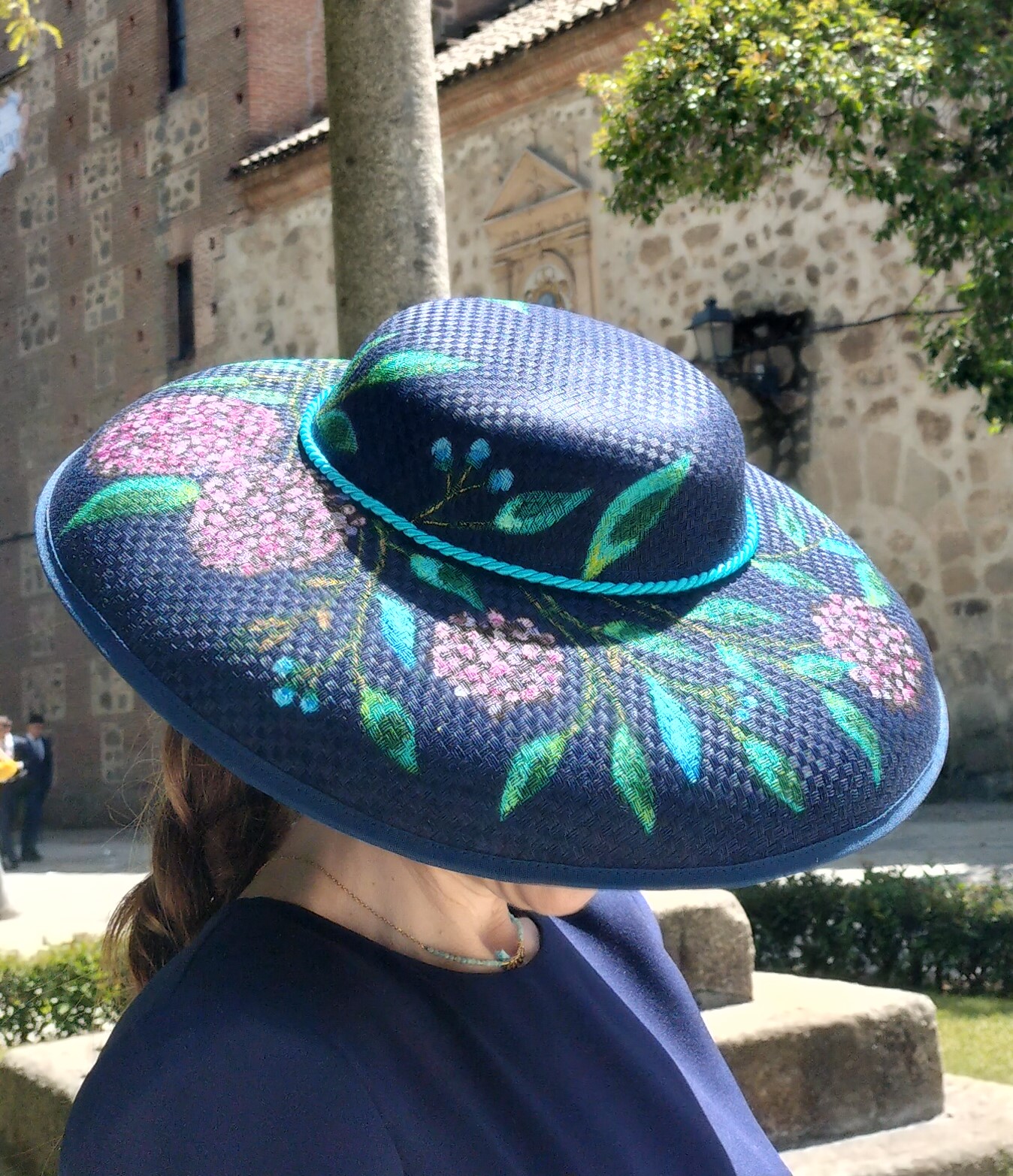 Está adornado con flores variadas, pintadas a mano para complementar esa base oscura. El resultado es un contraste clásico y alegre, una pieza que promete ser la envidia de cualquier jardín. Un consejo: Es el sombrero perfecto para esa boda de día donde sabes que la luz natural será tu mejor aliada. Elegancia garantizada… y un secreto de brillo que solo tú y el sol compartiréis.