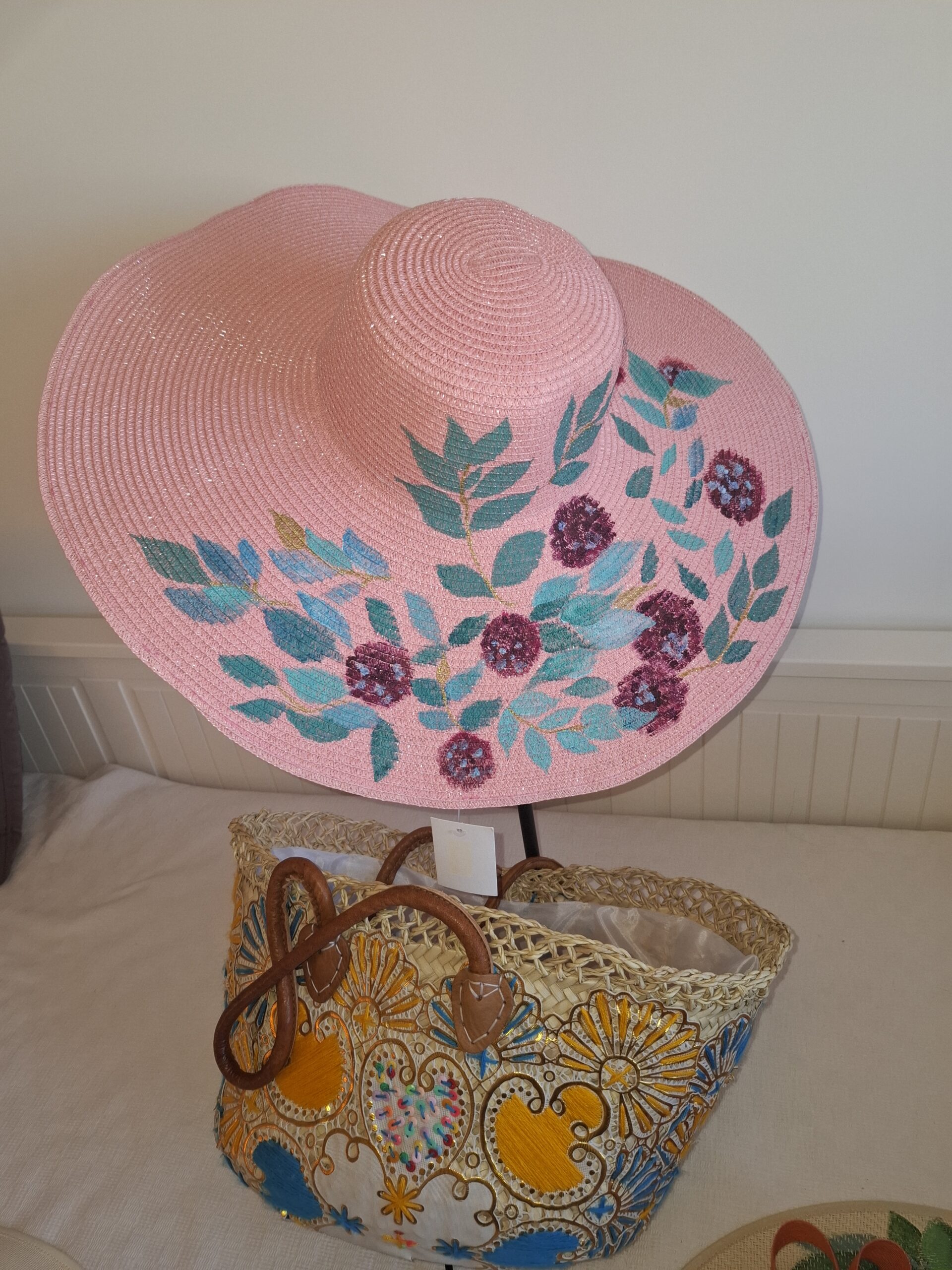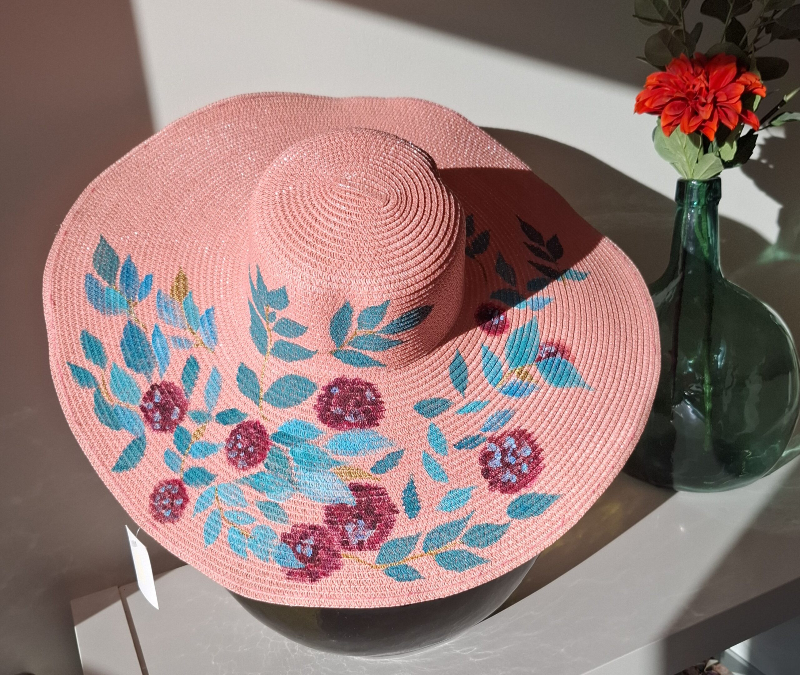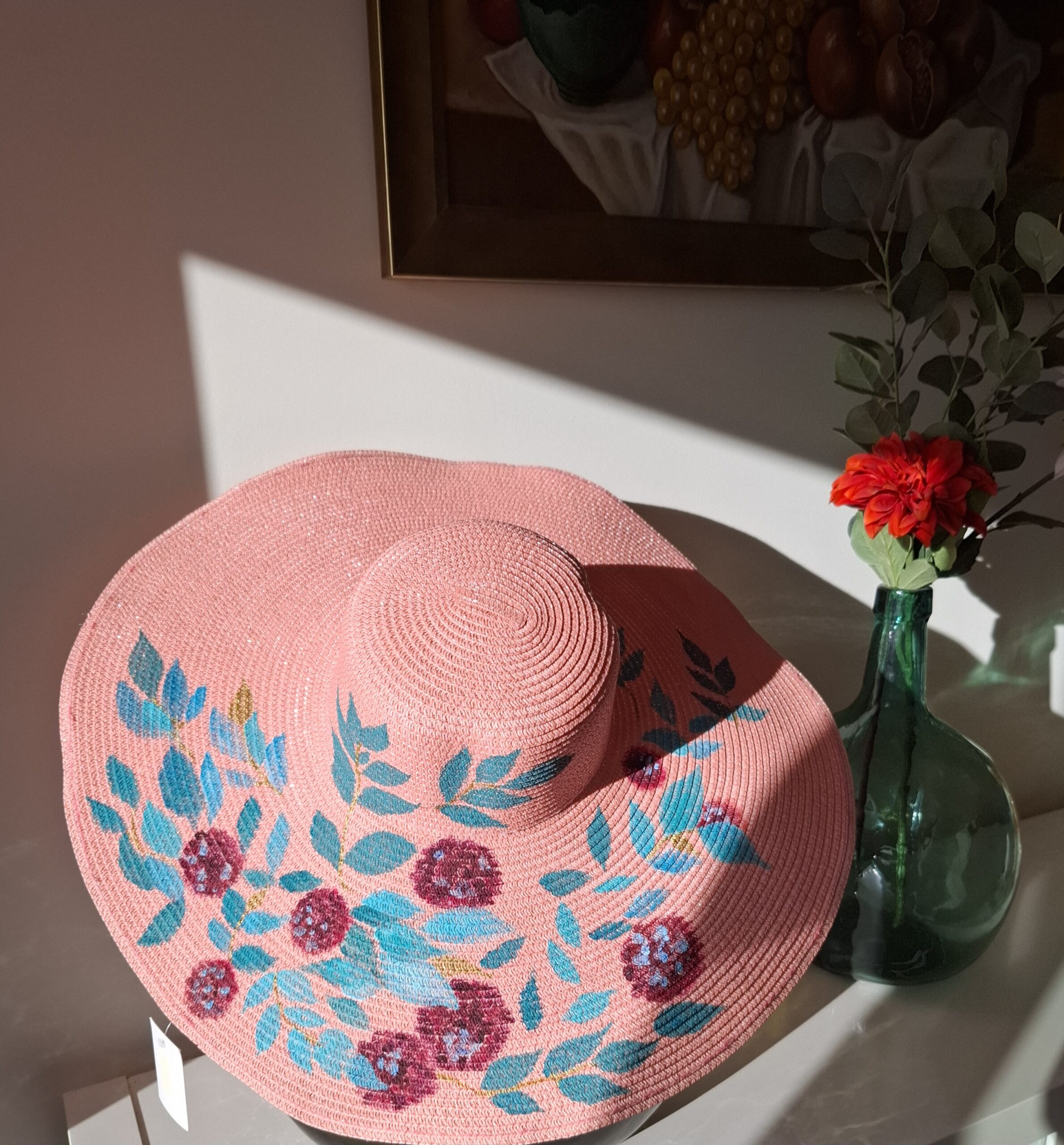Pamela rosa con flores elegante. Prepárate para ser el centro de todas las miradas con esta pamela rosa de impacto. Su tamaño imponente está compensado por la suavidad del tono, pero su secreto son las flores rojas intensas, pintadas a mano directamente sobre el ala. Es una pieza audaz que fusiona la inocencia del rosa con la pasión del carmín, garantizando un efecto ‘Guau’ instantáneo. Llevas arte que te protege del sol.